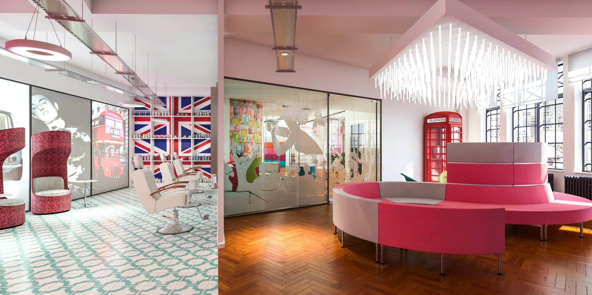 The client wanted a fun and inspiring space to thank his staff for making his company successful. They wanted their brushes to become a British icon, so moved into the old dance floors at Brixton Academy. My design respected the building, wanting to bring it back to it’s original beauty. The straight angled walls complimented the trapezium like the straight hair, whilst the furniture represented the knots which, ultimately, became iconic furniture designs, with nods to the 1930’s .